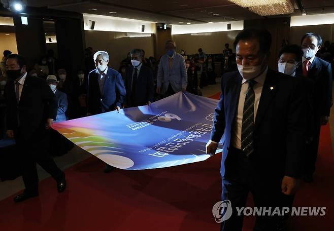 (서울=연합뉴스) 이지은 기자 = 한국문화원연합회 고문단이 28일 오후 서울 중구 프레지던트호텔에서 열린 한국문화원연합회 창립 60주년 비전 선포식에서 현수막을 들고 이동하고 있다. 2022.6.28