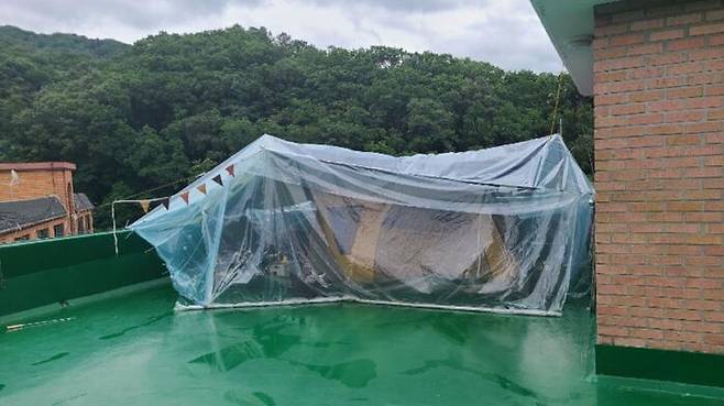 같은 날 A 씨는 구청에도 불법 시설물 신고를 했으나 이들은 텐트 위치를 옥상에 다른 구역으로 옮겼을 뿐이었습니다. 여기에 더해 옥상 문고리를 바꾸고, 캠핑용 릴선까지 연결해 더 꼼꼼하게 텐트를 쳤습니다.