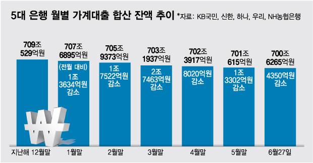 28일 은행권에 따르면 KB국민·신한·하나·우리·NH농협 등 5대 은행의 전날 기준 가계대출 잔액은 700조6265억원으로 지난해 말(709조529억원)보다 1.20%(8조4264억원) 감소했다. 5월 말(701조615억원)과 견줘선 4350억원 줄었다. 이달 남은 은행 영업일수(3일)까지 대출이 줄면 5대 은행 가계대출은 올 들어 6개월 연속 감소가 유력해 보인다.
