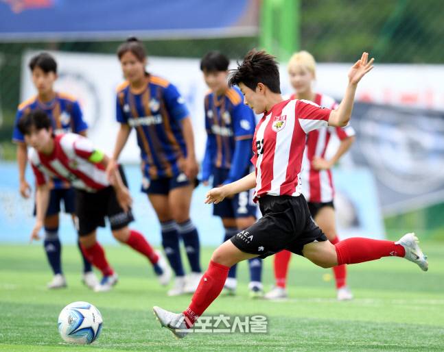 세종 고려대 이세란이 28일 삼척복합체육공원에서 열린 제30회 여왕기 전국여자축구대회 울산과학대와 경기에서 패널티킥 골을 넣고 있다.
