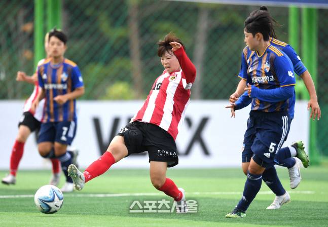 세종 고려대 김명진이 28일 삼척복합체육공원에서 열린 제30회 여왕기 전국여자축구대회 울산과학대와 경기에서 패스된 볼을 놓치고 있다.