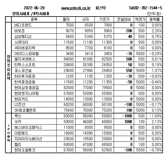 지아이이노베이션(2만원), 컬리(4만8500원), 싸이버로지텍(8100원), 현대삼호중공업(7만9500원), 현대카드(1만3500원), 디앤디파마텍(3만원), 엔지노믹스(2만8500원), 에이프로젠(1만6000원), 아크로스(8만7500원) 등 장외종목은 주가변동없이 장을 마감했다.