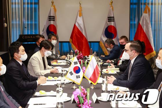 (서울=뉴스1) = 원희룡 국토교통부 장관이 28일 서울 모처에서 마르친 호라와 폴란드 신공항 특명전권대표, 미콜라이 빌드 폴란드 신공항사 사장 등으로 구성된 폴란드 신공항 협력단과 면담하고 있다. (국토교통부 제공) 2022.6.28/뉴스1