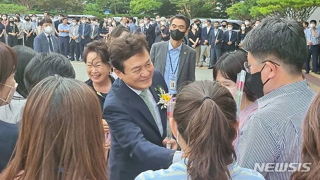 [청주=뉴시스] 김재광 기자 = 28일 충북도교육청 화합관에서 퇴임식을 한 김병우 충북교육감이 현관을 나서며 직원들에게 인사하고 있다. 한 직원이 김 교육감에게 장미꽃을 전달하고 있다.2022.06.28.kipoi@newsis.com