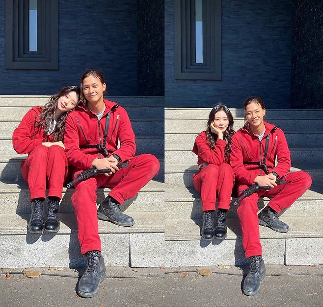 함께 공개한 사진에서는 김지훈과 이주빈이 넷플릭스 오리지널 시리즈 '종이의 집:공동경제구역'(이하 종이의 집) 속 레드 점프수트 의상을 입은 채 계단에 앉아 포즈를 취하고 있다.