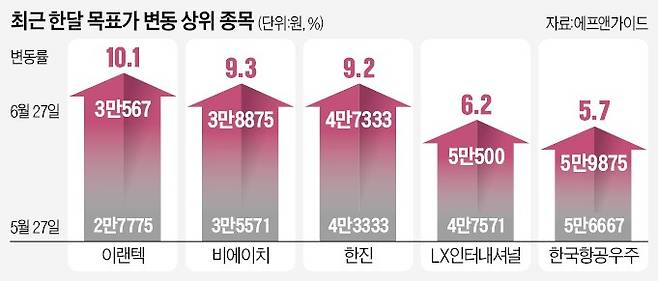 이 밖에 한진(9.2%) LX인터내셔널(6.2%) 한국항공우주(5.7%) 한국조선해양(5.3%) HSD엔진(5.1%)의 목표가가 많이 오른 것으로 나타났다.