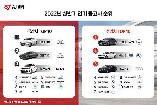 AJ셀카가 지난 5월까지 온·오프라인 거래 현황을 분석한 결과, 국산차는 '아반떼 AD', 수입차는 '벤츠 E-클래스 W213'의 거래량이 가장 많은 것으로 나타났다.