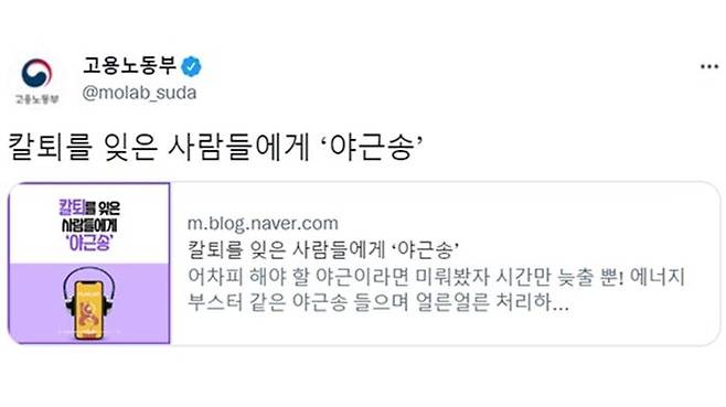 고용노동부가 공식 트위터 계정에 "칼퇴를 잊은 사람들에게 야근송"이라는 제목의 글을 올렸다가 논란이 일자 삭제했습니다.