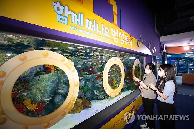 (서울=연합뉴스) 롯데월드 아쿠아리움이 '제주바다 in 범섬투어' 특별전을 개최한다고 28일 밝혔다. 사진은 '제주바다 in 범섬투어' 관람하는 손님들. 2022.6.28 [롯데월드 제공. 재판매 및 DB 금지]