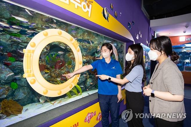 (서울=연합뉴스) 롯데월드 아쿠아리움이 '제주바다 in 범섬투어' 특별전을 개최한다고 28일 밝혔다. 사진은 제주 범섬 바다의 해양생물과 산호정원 설명하는 아쿠아리스트. 2022.6.28 [롯데월드 제공. 재판매 및 DB 금지]