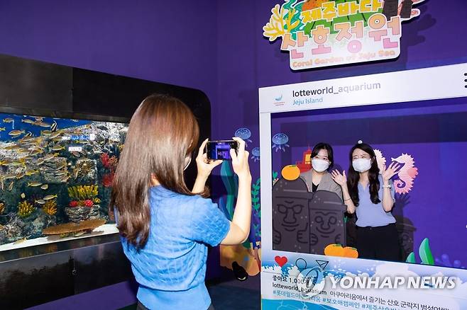 (서울=연합뉴스) 롯데월드 아쿠아리움이 '제주바다 in 범섬투어' 특별전을 개최한다고 28일 밝혔다. 사진은 '제주바다 in 범섬투어' 포토존에서 기념사진 촬영하는 손님들. 2022.6.28 [롯데월드 제공. 재판매 및 DB 금지]