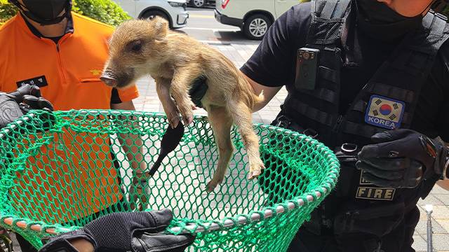 아파트 화단에서 새끼 멧돼지 2마리를 발견한 소방당국은 약 20분 만에 멧돼지를 동물 포획용 그물로 생포했습니다.