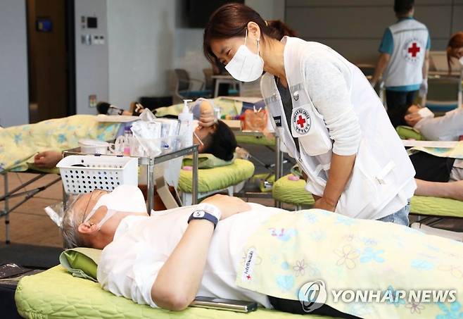 (서울=연합뉴스) 28일 서울 여의도 파크원 NH금융타워에서 열린 '사랑의 나눔 헌혈 행사'에서 정영채 NH투자증권 사장과 임직원이 헌혈하고 있다. 2022.6.28 [NH투자증권 제공. 재판매 및 DB 금지]