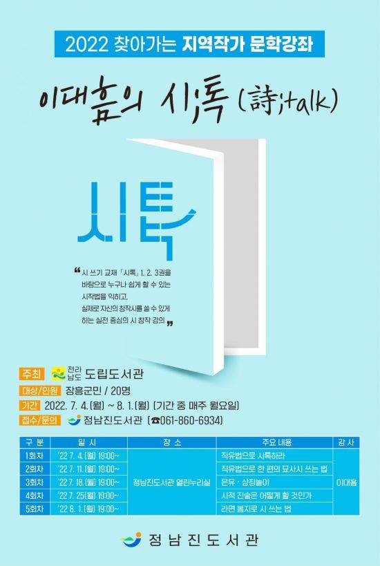 이번 강좌 ‘이대흠의 시;톡(詩;talk)’은 이대흠시인의 시 쓰기 교재 ‘시톡1,2,3’을 바탕으로 누구나 쉽게 할 수 있는 시작법을 익히고, 실제로 자신의 창작시를 쓸 수 있게 하는 실전 중심의 시 창작 강의다.