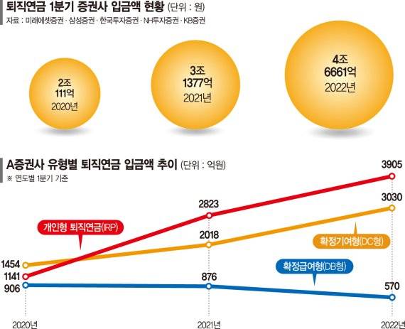 28일 금융투자업계에 따르면 올해 1·4분기 미래에셋증권, 삼성증권, 한국투자증권, NH투자증권, KB증권 등 5개 증권사로의 퇴직연금 입금액은 4조6661억원에 달했다. 지난 2020년 1·4분기에 2조111억원, 2021년 1·4분기에 3조1377억원을 기록한 것과 비교하면 해마다 50%씩 늘어난 것으로 집계됐다.