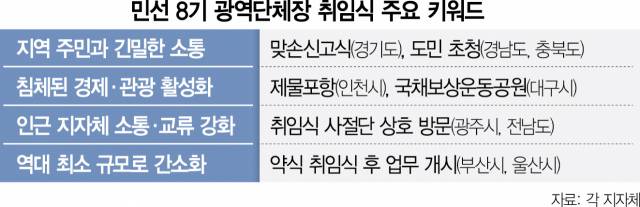 김두겸 울산시장 당선인은 울산시청 대강당에서 60여명을 대상으로 조촐하게 열린다. 이날 취임식에는 지역사회에 감동을 전하거나 선행을 베푼 시민들을 특별 초청 형식으로 초대한다. 민선 8기 출범에 대한 각계각층 시민들의 희망을 모은 영상물 ‘시민의 말씀을 듣습니다’를 상영해 혁신 시정의 의지를 다짐하겠다는 계획이다. 또 박완수 경남도지사 당선인은 기존 초청 인사 중심의 딱딱한 취임식 대신 추첨을 통해 시민 50명을 초청하는 행사로 취임식을 대체한다.
