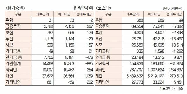 [표]유가증권·코스닥 투자주체별 매매동향(6월 28일-최종치)