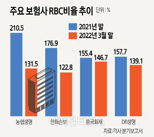 28일 보험업계에 따르면 지난 1분기 RBC 비율이 150% 이하로 떨어진 보험사가 속출했다. 올해 3월 말 기준 NH농협생명의 RBC비율은 131.5%로 전년 말 대비 79%포인트 급락했다.