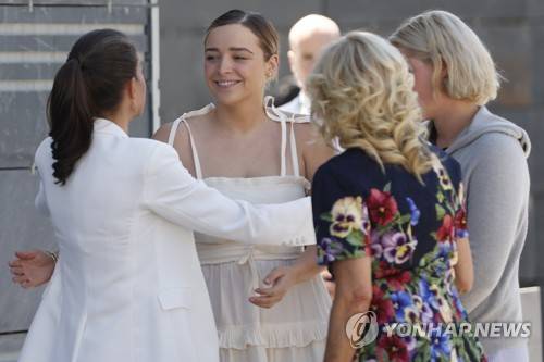epa10037986 Spanish Queen Letizia (L) greets Finnegan Biden (C), granddaughter of US First Lady Jill Biden (2-R), during their visit a reception centre for Ukrainian refugees in Pozuelo de Alarcon on the sidelines of the NATO Summit, in Madrid, Spain, 28 June 2022. Heads of State and Government of NATO's member countries and key partners are gathering in Madrid on 28-30 June to discuss security concerns like Russia's invasion of Ukraine and other challenges like China's growing influence. Spain is hosting 2022 NATO Summit coinciding with the 40th anniversary of its accession to NATO. EPA/MARISCAL