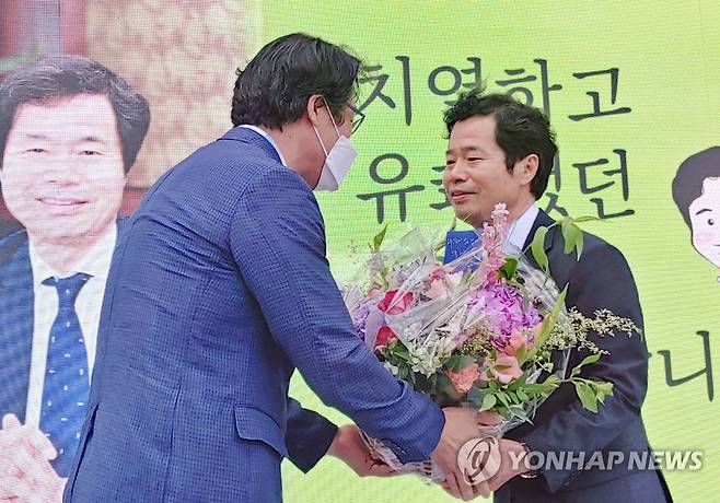 (전주=연합뉴스) 최영수 기자 = 김승환 전북교육감이 28일 도교육청에서 열린 이임식에서 꽃다발을 받고 있다. 2022.6.28