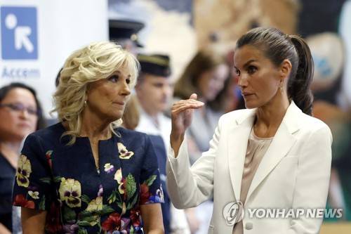 epa10038069 Spanish Queen Letizia (R) and US First Lady Jill Biden visit a reception centre for Ukrainian refugees in Pozuelo de Alarcon on the sidelines of the NATO Summit, in Madrid, Spain, 28 June 2022. Heads of State and Government of NATO's member countries and key partners are gathering in Madrid on 28-30 June to discuss security concerns like Russia's invasion of Ukraine and other challenges like China's growing influence. Spain is hosting 2022 NATO Summit coinciding with the 40th anniversary of its accession to NATO. EPA/MARISCAL
