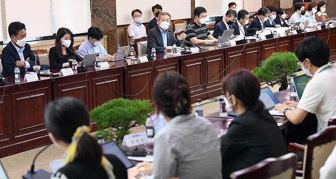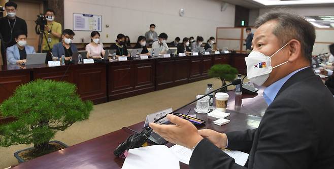 행정안전부 출입기자 간담회가 28일 서울 종로구 정부서울청사에서 열렸다. 이상민 장관이 질문에 답하고 있다.