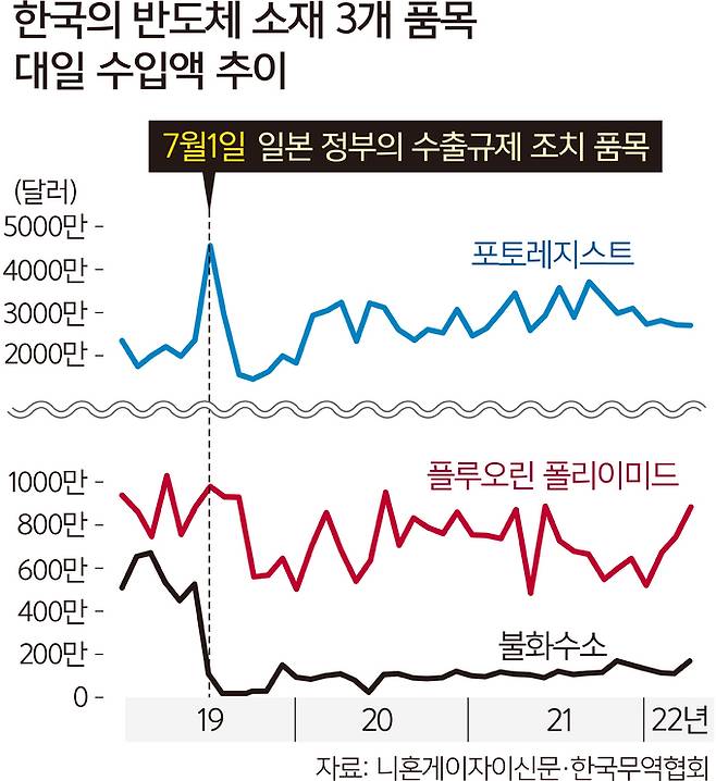 일본 정부는 사실상 강제동원 피해자 배상 판결에 대한 보복 조치로 2019년 7월1일 반도체 소재인 불화수소, 포토레지스트, 플루오린 폴리이미드 3개 품목의 한국 수출규제를 강화한다고 발표하고 이어 같은 해 8월19일 한국을 화이트리스트(수출 절차 우대국)에서 제외했다.