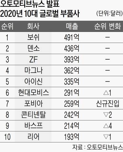 오토모티브뉴스는 글로벌 부품사들이 완성차 업체를 대상으로 거둔 직전 연도 매출을 기준으로 글로벌 부품사 순위를 발표하며, 이는 부품업체들의 경쟁력으로 평가받고 있다. 현대모비스는 지난해 완성차 업체를 대상으로 291억달러(약 37조4000억원)의 매출을 거둔 것으로 집계됐다.