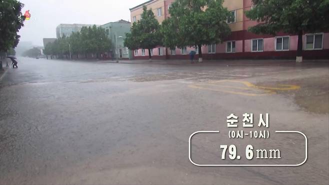 [서울=뉴시스] 북한 조선중앙TV가 28일 평양시를 비롯한 각지에서 폭우를 동반한 많은 비가 내렸다고 보도하고 있다. (사진=조선중앙TV 캡쳐) 2022.06.28. photo@newsis.com *재판매 및 DB 금지