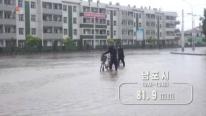 [서울=뉴시스] 북한 조선중앙TV가 28일 평양시를 비롯한 각지에서 폭우를 동반한 많은 비가 내렸다고 보도하고 있다. (사진=조선중앙TV 캡쳐) 2022.06.28. photo@newsis.com *재판매 및 DB 금지