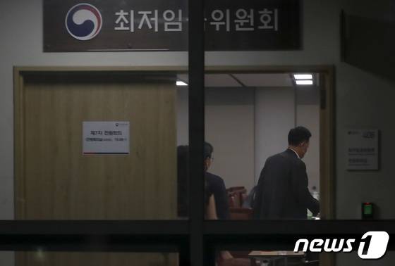 (세종=뉴스1) 김기남 기자 = 28일 밤 정부세종청사 최저임금위원회 회의실에서 열린 제7차 전원회의에서 1차 수정안으로 근로자위원 측 1만 340원, 사용자위원 측 9260원 제출 후 합의점을 찾지 못하며 박준식 위원장의 2차 수정안 제출 요청으로 회의가 중단 된 채 사용자 측과 근로자 측이 팽팽한 줄다리기를 하고 있다.2022.6.28/뉴스1