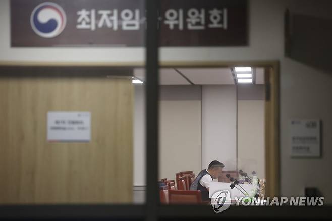 (세종=연합뉴스) 김주형 기자 = 내년도 최저임금 심의에 참여 중인 노동계와 경영계가 최저임금 최초 요구안의 수정안을 각각 제출한 28일 오후 세종시 정부세종청사 최저임금위원회 회의실에서 제7차 전원회의가 잠시 휴정한 가운데 근로자위원인 이동호 한국노총 사무총장이 무언가를 보고 있다. 2022.6.28