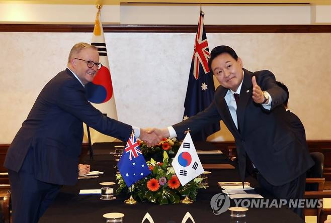 (마드리드=연합뉴스) 서명곤 기자 = 북대서양조약기구((NATO·나토) 정상회의 참석을 위해 스페인을 방문 중인 윤석열 대통령이 28일(현지시간) 마드리드 시내 한 호텔에서 열린 한·호주 정상회담에서 앤서니 앨버니지 호주 총리와 악수를 하고 있다. 2022.6.28