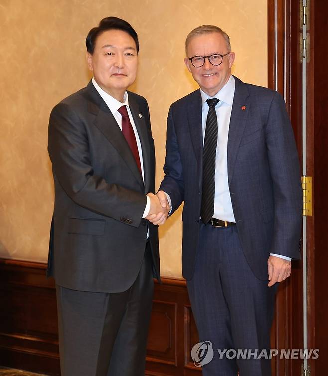 (마드리드=연합뉴스) 서명곤 기자 = 북대서양조약기구(NATO·나토) 정상회의 참석을 위해 스페인을 방문 중인 윤석열 대통령이 28일(현지시간) 마드리드 시내 한 호텔에서 열린 한·호주 정상회담에서 앤서니 앨버니지 호주 총리와 악수를 하고 있다. 2022.6.28