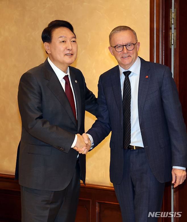 [마드리드=뉴시스] 전신 기자 = 윤석열 대통령이 28일(현지시간) 마드리드 한 호텔에서 열린 한국·호주 정상회담에서 앤서니 알바니스 호주 총리와 악수하고 있다. (대통령실통신사진기자단) 2022.06.28. photo1006@newsis.com