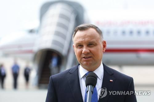epa10038570 Polish President Andrzej Duda during his speech to the media at the Warsaw airport in Warsaw, Poland, 28 June 2022, before his flight to the NATO summit in Madrid. The main topic of talks by the participants at the NATO summit in Madrid will be the activities of the Alliance in connection with Russia's invasion of Ukraine. EPA/RAFAL GUZ POLAND OUT