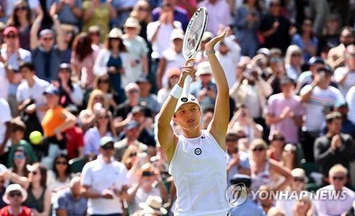 epa10038581 Iga Swiatek of Poland celebrates after winning the women's first round match against Jana Fett of Croatia at the Wimbledon Championships, in Wimbledon, Britain, 28 June 2022. EPA/ANDY RAIN EDITORIAL USE ONLY