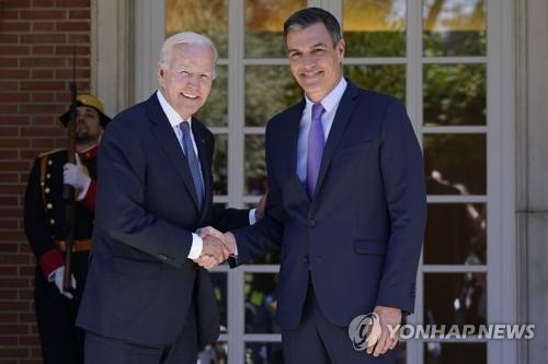 President Joe Biden and Spain's President Pedro Sanchez shake hands as they meet at the Palace of Moncloa in Madrid, Tuesday, June 28, 2022, to discuss continuing efforts to support Ukraine. Biden will also be attending the North Atlantic Treaty Organization summit in Madrid. (AP Photo/Susan Walsh)