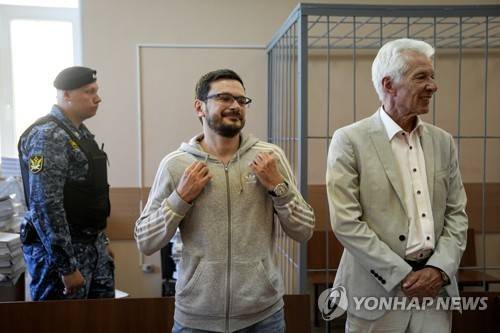 Ilya Yashin, Russian opposition activist and a municipal deputy of the Krasnoselsky district of Moscow, center, and his lawyer Mikhail Biryukov, right, attend a session Moscow, Russia, Tuesday, June 28, 2022. On Tuesday, prominent opposition politician Ilya Yashin was sentenced to 15 days in jail on charges of failing to obey police. He was detained late Monday while walking in a park and police said he had grabbed one by the uniform and vulgarly insulted them. (AP Photo/Alexander Zemlianichenko)