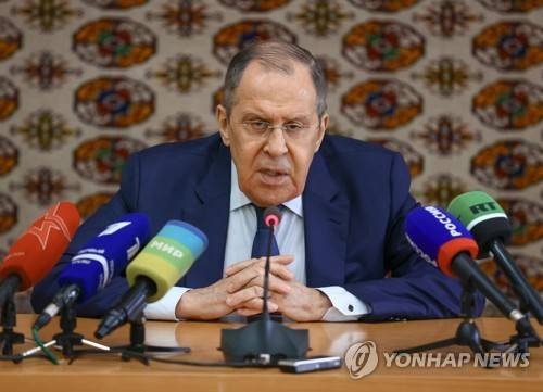 epa10038600 A handout photo made available by the press service of the Russian Foreign Affairs Ministry shows Russian Foreign Minister Sergei Lavrov speaking to journalists after the Caspian states Foreign Ministers meeting in Ashgabat, Turkmenistan, 28 June 2022. The Caspian states foreign ministers meeting is held ahead of the Sixth Caspian Summit which will be held in Ashgabat on 29 June 2022. EPA/RUSSIAN FOREIGN AFFAIRS MINISTRY / HANDOUT MANDATORY CREDIT HANDOUT EDITORIAL USE ONLY/NO SALES