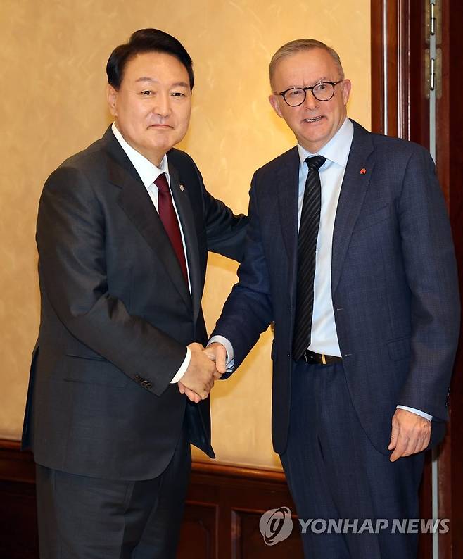 (마드리드=연합뉴스) 서명곤 기자 = 북대서양조약기구(NATO·나토) 정상회의 참석을 위해 스페인을 방문 중인 윤석열 대통령이 28일(현지시간) 마드리드 시내 한 호텔에서 열린 한·호주 정상회담에서 앤서니 앨버니지 호주 총리와 악수하고 있다. 2022.6.28