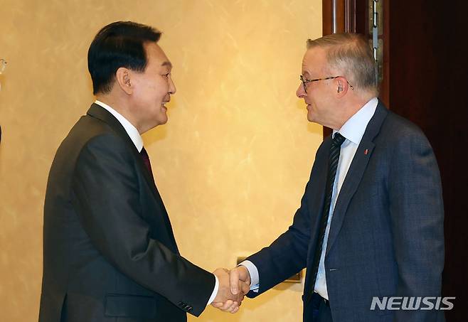 [마드리드=뉴시스] 전신 기자 = 윤석열 대통령이 28일(현지시간) 마드리드 한 호텔에서 열린 한국·호주 정상회담에서 앤서니 알바니스 호주 총리와 악수하고 있다. (대통령실통신사진기자단) 2022.06.28. photo1006@newsis.com
