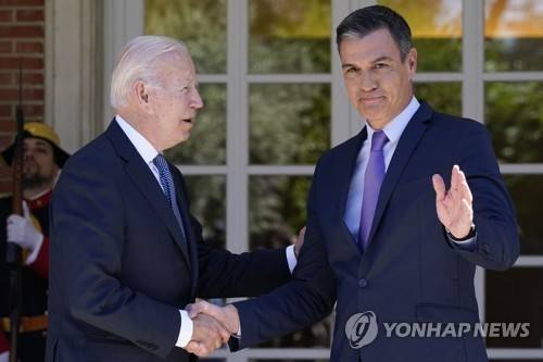 President Joe Biden and Spain's President Pedro Sanchez shake hands as they meet at the Palace of Moncloa in Madrid, Tuesday, June 28, 2022, to discuss continuing efforts to support Ukraine. Biden will also be attending the North Atlantic Treaty Organization summit in Madrid. (AP Photo/Susan Walsh)