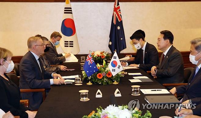 (마드리드=연합뉴스) 서명곤 기자 = 북대서양조약기구(NATO·나토) 정상회의 참석을 위해 스페인을 방문 중인 윤석열 대통령이 28일(현지시간) 마드리드 시내 한 호텔에서 열린 한·호주 정상회담에서 발언을 하고 있다. 2022.6.28