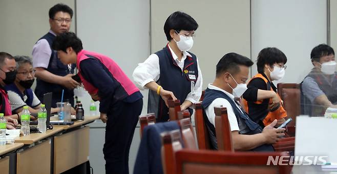 [세종=뉴시스] 강종민 기자 = 내년도 최저임금을 결정 법정시한(6월 29일)을 하루 앞둔 28일 밤 세종시 정부세종청사에서 열린 최저임금위원회 7차 전원회의에 근로자 위원인 박희은(민주노총 부위원장)이 자리로 향하고 있다. 오른쪽은 이동호(한국노총 사무총장) 근로자 위원. 2022.06.28. ppkjm@newsis.com