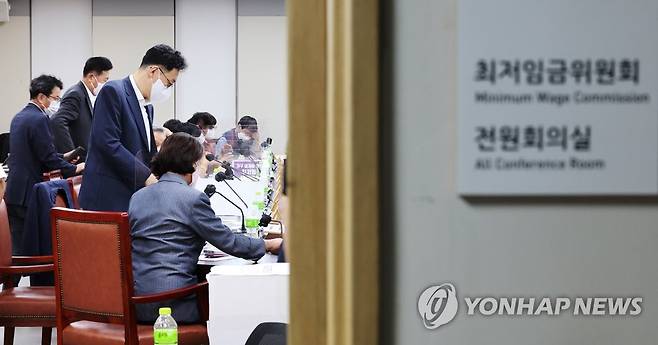(세종=연합뉴스) 김주형 기자 = 내년도 최저임금 심의에 참여 중인 노동계와 경영계가 최저임금 최초 요구안의 수정안을 각각 제출한 28일 오후 세종시 정부세종청사 최저임금위원회 회의실에서 열린 제7차 전원회의가 잠시 휴정한 뒤 다시 시작되자 사용자위원과 근로자위원들이 착석하고 있다. 2022.6.28