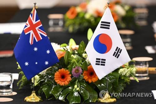epa10038686 An Australian flag and the flag of the Republic of Korea are seen during a bilateral meeting between Australian Prime Minister Anthony Albanese and the President of the Republic of Korea Yoon Seok-youl (both not pictured) ahead of the NATO Leaders? Summit in Madrid, Spain, 28 June 2022. Australian Prime Minister Anthony Albanese will join leaders of Japan, South Korea, and New Zealand for a Nato Leaders? Summit in Spain, before flying to France in a bid to repair the relationship with French President Emmanuel Macron. EPA/LUKAS COCH NO ARCHIVING AUSTRALIA AND NEW ZEALAND OUT