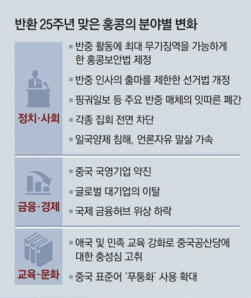 송환법 반대 시위 이후 홍콩에 대한 직접 통치를 강화해온 중국은 2020년 반중 활동에 최대 무기징역을 허용한 홍콩 국가보안법을 제정했다. 지난해에는 반중 인사의 출마를 원천 차단한 선거법 개정 등을 강행했다. 이로 인해 반환 당시 중국이 “50년간 ‘일국양제(一國兩制·한 국가 두 체제)’를 보장하겠다”고 했던 약속은 사실상 휴지 조각이 됐다는 평가가 나온다.