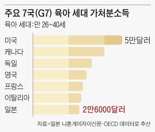 주요 7국(G7)과 비교하면 일본 젊은 층의 소득 수준은 더욱 두드러진다. 니혼게이자이가 경제협력개발기구(OECD) 자료를 바탕으로 26~40세 젊은 층의 평균 연간 가처분소득을 추산해 비교한 결과, 일본은 약 2만6000달러(약 3340만원)에 불과해 7국 중 최하위에 머물렀다. 1위 미국(5만달러)과 비교하면 절반을 조금 넘는 수준이다.