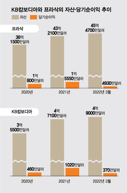 프라삭과의 통합을 통해 KB캄보디아는 현지 리딩뱅크로 거듭날 수 있다는 자신감을 내비치고 있다. 소액대출뿐 아니라 상업은행을 포함한 전체 시장에서 프라삭의 규모는 4위 수준이다. 올 1분기 기준 프라삭의 자산 규모는 45억4700만달러다. 당기순이익은 4930만달러를 기록했다. 성장세도 가파르다. 프라삭의 2020년 말 자산규모는 36억1500만달러였고, 순이익은 1억달러 수준이었다. 올 1분기 KB캄보디아의 경우 자산 규모는 4억9000만달러, 순이익은 370만달러로 집계됐다.